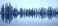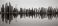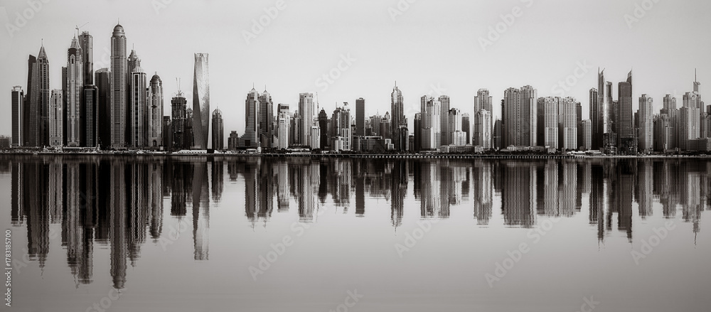 • Monochrome city skyline with tall skyscrapers reflecting on calm water under a cloudy sky, Dubai Marina bay UAE