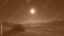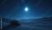 • Bright star shines over desert dunes at night. Celestial light guides journey over barren land. Majestic sky with distant mountains. Serene winter night.