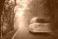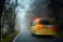 • Emergency ambulance speeding on road in heavy fog on gloomy autumn day. Motion blur conveying urgency, danger and rapid response of medical rescue services in poor visibility conditions.