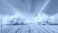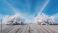 • Snow-laden frozen trees and shrubs on a wooden deck beneath a clear blue winter sky, showcasing seasonal change