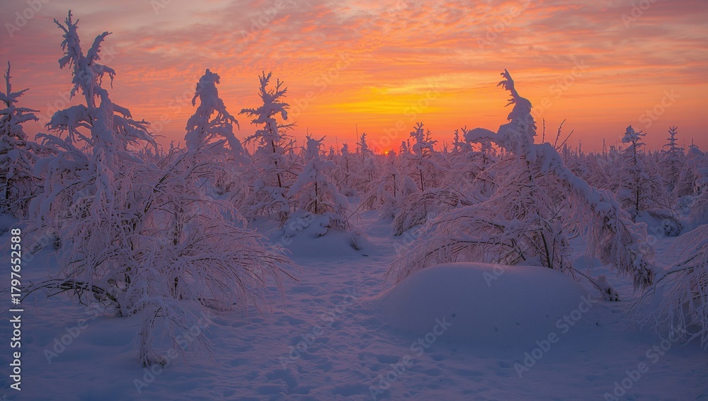 Obraz Pejzaże - Winter sunset landscape with frozen trees, seasonal change #1797652588