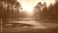 • Golden sun shines across golf course at twilight. Tall pine trees frame beautiful scene. Fairways, greens glow with warm light. Smooth sand bunkers visible on well-kept grounds. Nature, sport combine