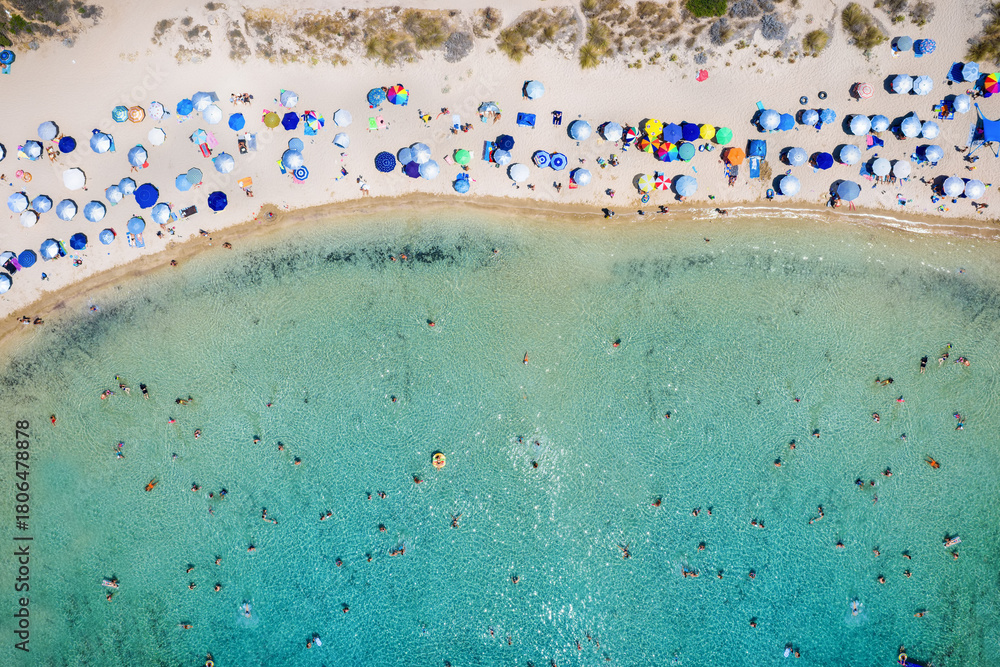 Obraz Pejzaże - Aerial overhead view of a crowded beach with turquoise sea as seen in Messinia, Greece, during... #1806478878