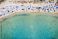 • Aerial overhead view of a crowded beach with turquoise sea as seen in Messinia, Greece, during summer time