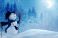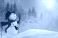 • Cute smiling snowman with red scarf and hat with a broom in his hand. Winter fairytale.Merry christmas and happy new year greeting card with copy-space