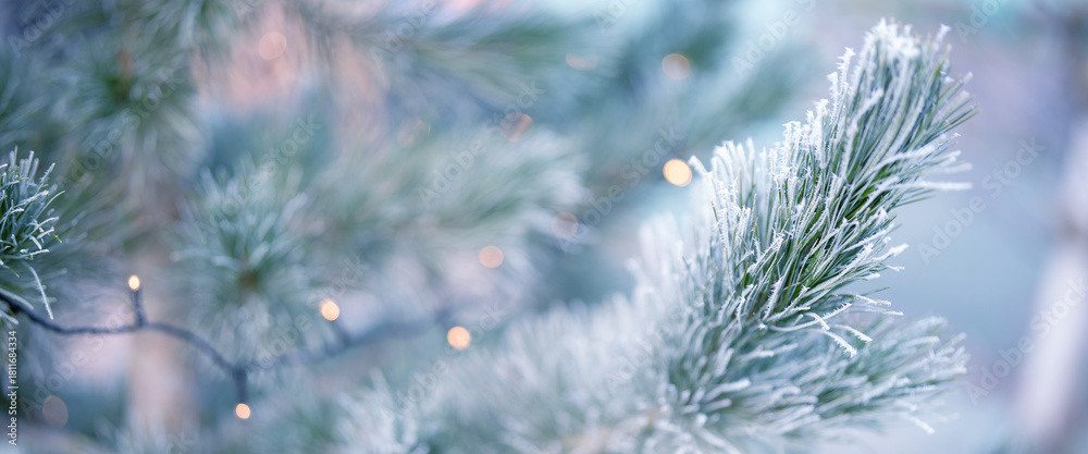 • Pine branches in winter with frozen hoarfrost. Horizontal close-up of a natural christmas tree outdoors.