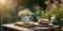 • Chamomile flowers in a white enamel mug placed on a garden table with a book and braided hat, summer nature background, seasonal outdoor setting