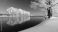 • Breathtaking Winter Scene Snow-Covered Trees Mirrored in a Crystal Clear Blue Lake Under Bright Sun