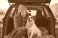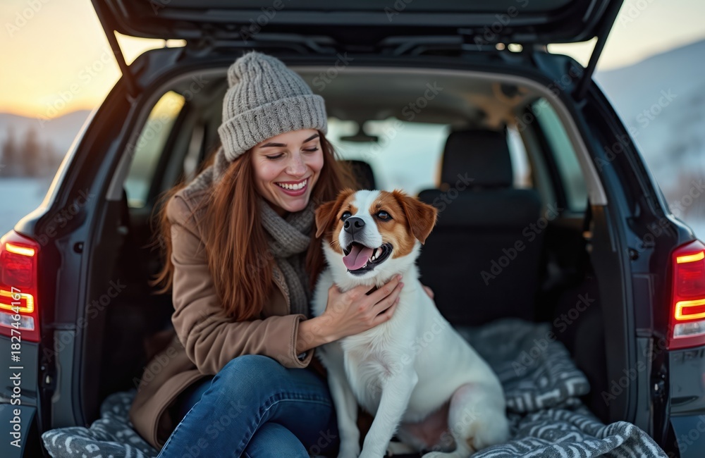 • Woman and dog in car trunk. They enjoy winter landscape. Lady smiles with her jack russell in the snowy mountains. Pet owner traveling with her dog together.