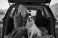 Obraz Pejzaże - Woman and dog in car trunk. They enjoy winter landscape. Lady smiles with her jack russell in the... #1827464167