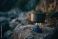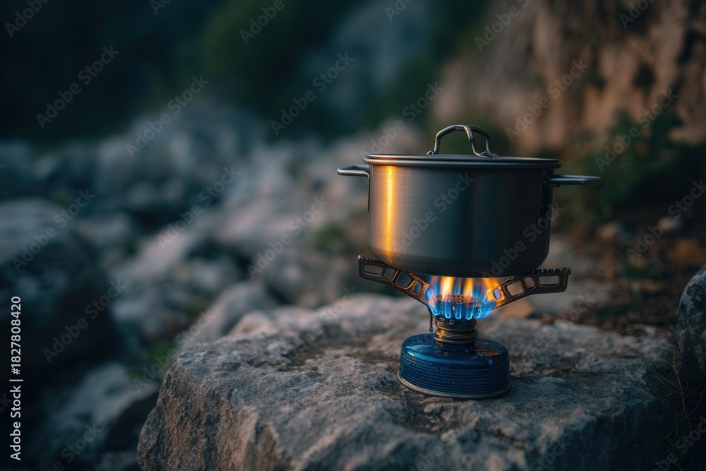 • Cooking pot heating up on a gas burner on a rock during an outdoor adventure