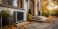 • Autumn outdoor heat pump next to elegant house entrance amidst fall foliage
