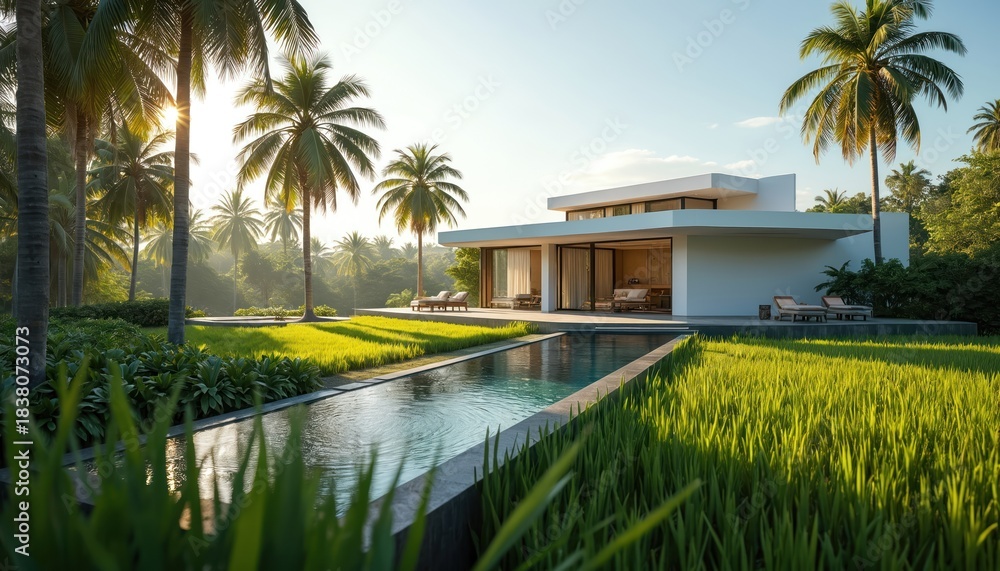 Modern tropical villa. Exterior photo shows white house with pool. Tall palm trees surround building. Sun shines on green grass. Luxury vacation home located in nature. od 0,00 zł Dopasuj i kup Naklejka