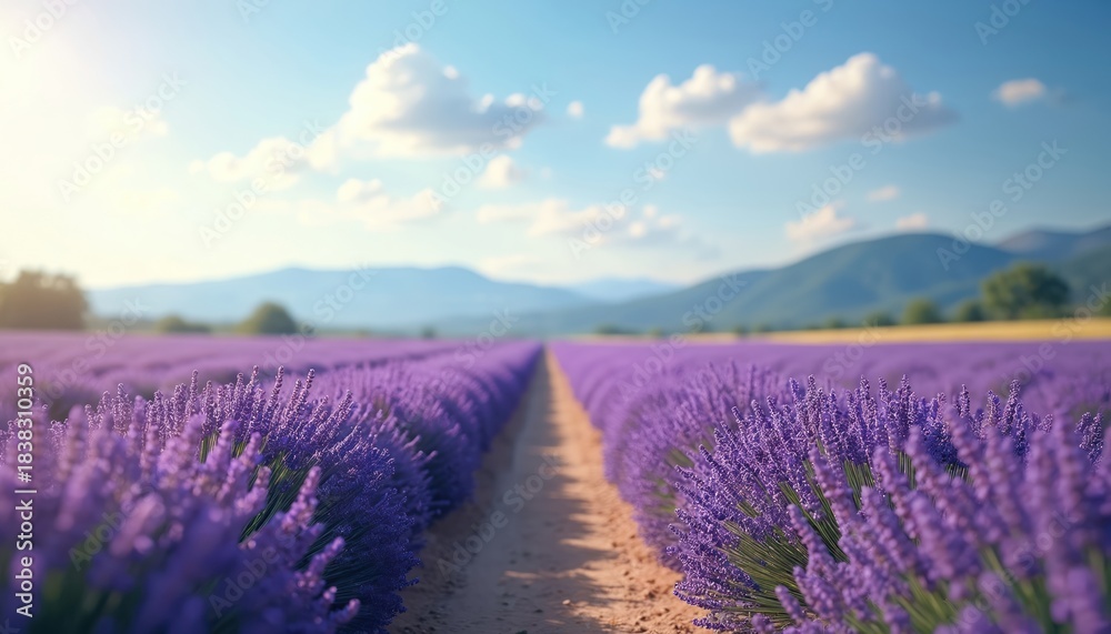 Vast purple lavender field under blue sky with fluffy white clouds. Distant mountains complete serene summer landscape. Aromatic flowers bloom in neat rows, creating natural beauty in countryside on od 0,00 zł Dopasuj i kup