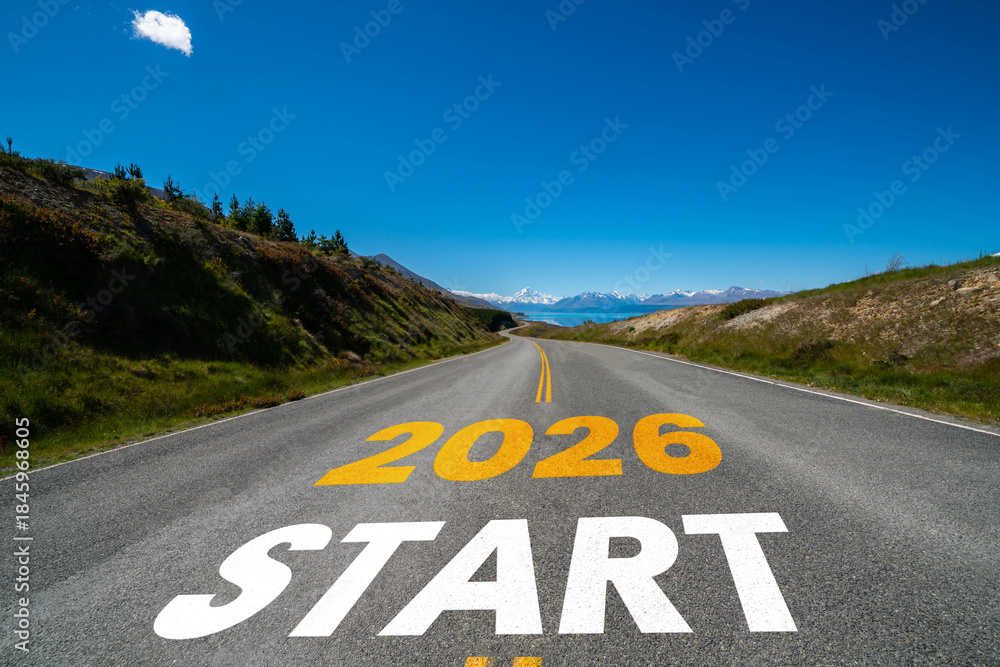 • 2026 New Year road trip travel and future vision concept . Nature landscape with highway road leading forward to happy new year celebration in the beginning of 2026 for glee and successful start .