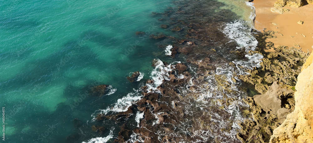 Ocean waves rolling to the rocky shore. Beautiful seascape. Aerial top view of the beautiful ocean rocky shore with rolling waves. Drone is hovering over rolling ocean waves to rocky shore od 0,00 zł Dopasuj i kup Naklejka