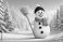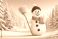 • Cheerful snowman sweeping the snowy ground in a blue winter forest scene