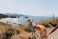 • Dog on cliff trail looking down at empty beach off Oregon Coast
