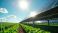 Obraz Pejzaże - Vast green field with rows of plants under solar panels. Sunny blue sky with clouds above large... #1863289439