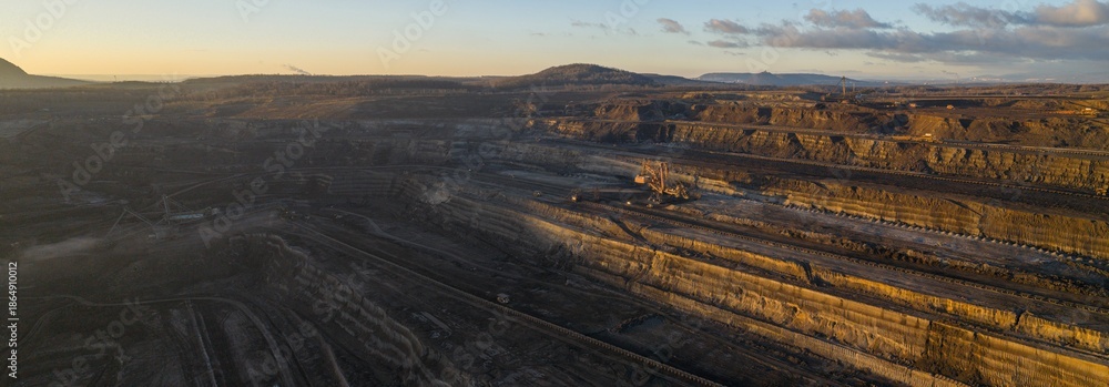 • High resolution panoramic view of an open pit coal mine with mining machines, layered terrain. Industrial landscape showing large scale extraction, energy production, and environmental impact.