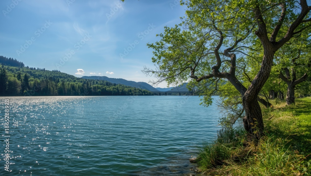Obraz Pejzaże - Tri-Cities Washington State's Columbia River with water, sky, and forested land, highlighting... #1865288928
