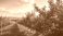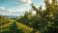 • Summer scene of an orchard with blossoming apple trees, suitable as a natural backdrop for agricultural layouts