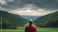 Man in a red shirt and cap looking at a beautiful golf course surrounded by green hills under a cloudy sky. Sports, nature and relaxation concept. od 0,00 zł Dopasuj i kup Plakat