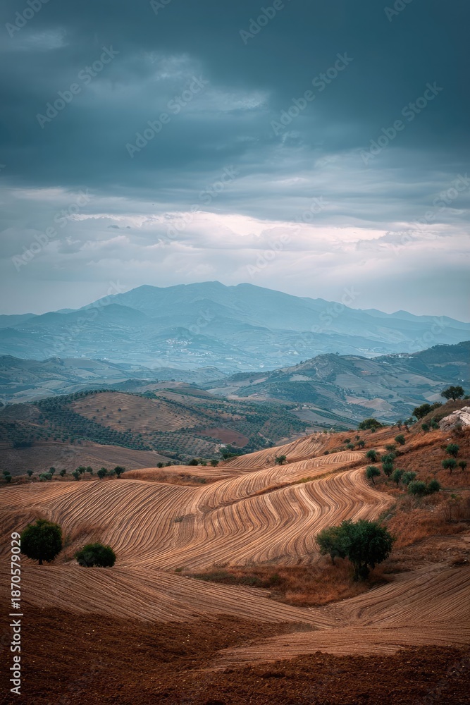 Obraz Pejzaże - Terraced farmland on rolling hills under a moody, stormy sky with distant blue mountains. Concept... #1870579029