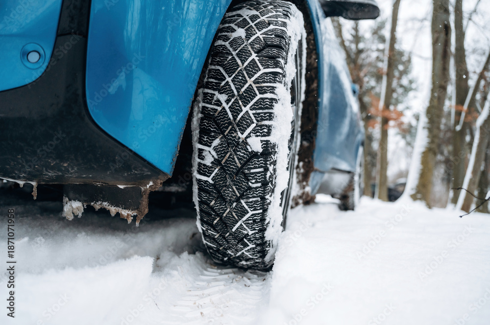 Obraz Pejzaże - Close-up of a winter tire on a blue vehicle, showcasing tread patterns in snow-covered terrain,... #1871071958