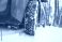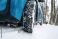 • Close-up of a winter tire on a blue vehicle, showcasing tread patterns in snow-covered terrain, emphasizing traction and winter driving conditions for safety and performance