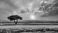 • Iconic African Sunset with Lone Acacia Tree in Savanna, sky with golden light and clouds