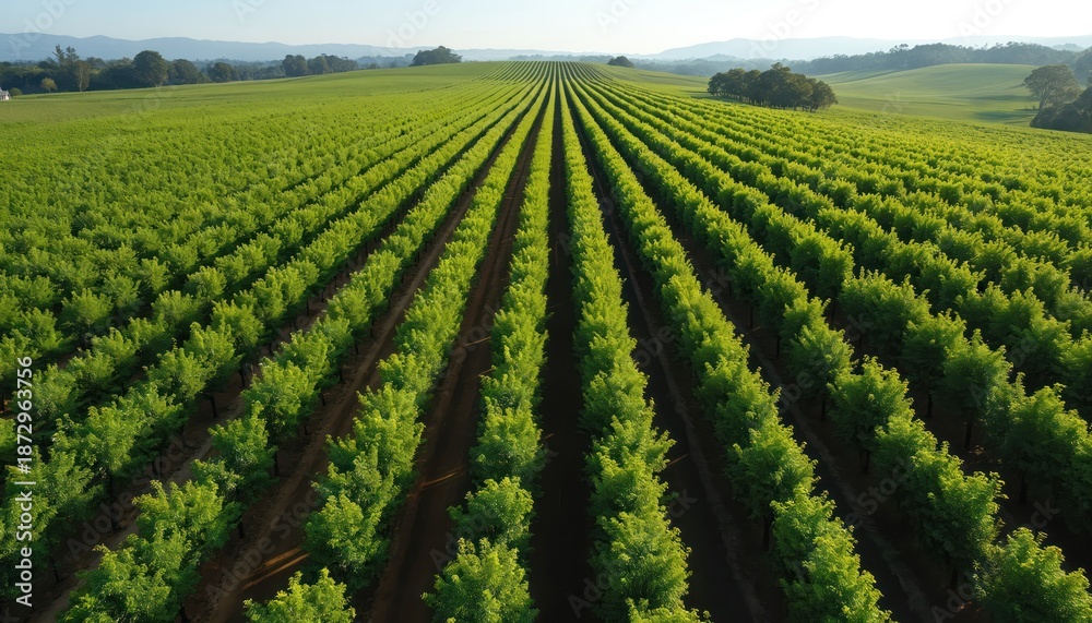 Obraz Pejzaże - Rows of green macadamia trees stretch into distance on sunny day. Verdant farm landscape shows... #1872963756