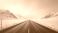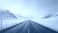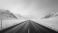 • Empty asphalt road winds through snowy mountains. A long straight highway leads into a foggy, vast winter landscape. Clear path towards horizon under pale sky.
