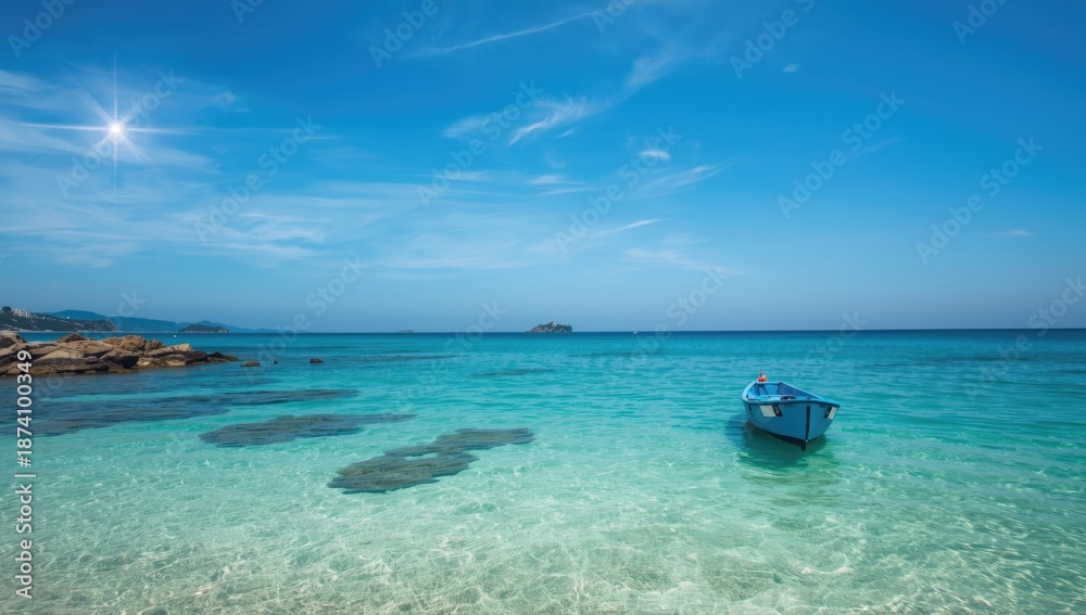 Obraz Pejzaże - Sailboat floating in calm blue water under a bright sky, suitable for ocean-themed UI backgrounds #1874100349