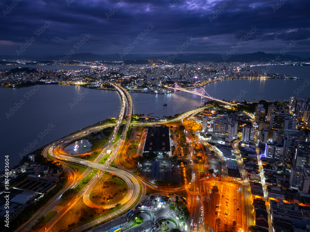 Obraz Pejzaże - Aerial view of the city of Florianopolis during twilight. Brazil #1874493604