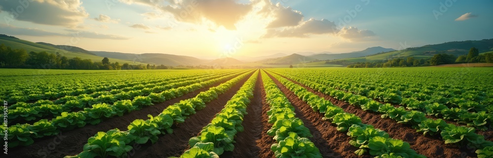 • Vast green fields with rows of fresh lettuce grow under golden sun. Rolling hills form backdrop for this abundant farm at dawn. Healthy food cultivation in natural rural setting.