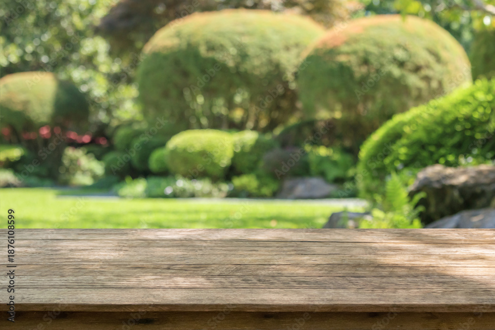 • Empty wood table top with abstract blur park garden background