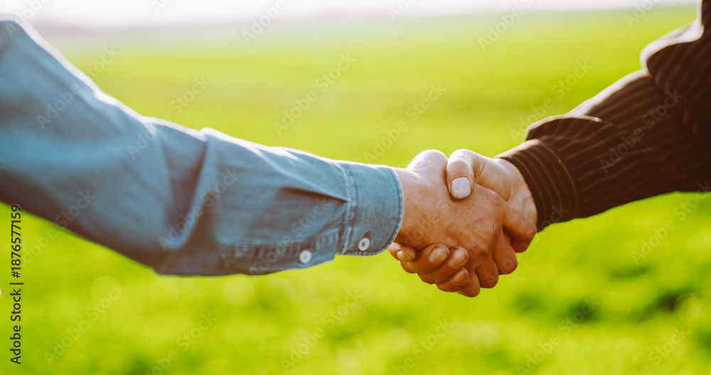 A close-up of two farmers shaking hands against a backdrop of a green agricultural field. Two agronomists shaking hands at sunset. Concept: agriculture, farming, business. Agreements. od 0,00 zł Dopasuj i kup