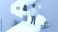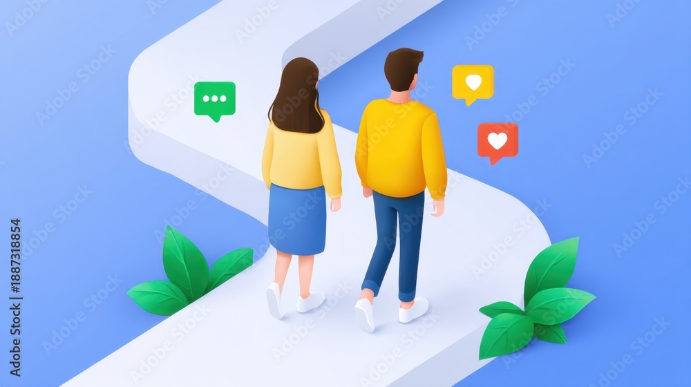 Young couple walking along a winding path with colorful chat bubbles, symbolizing communication and connection in a digital age od 0,00 zł Dopasuj i kup