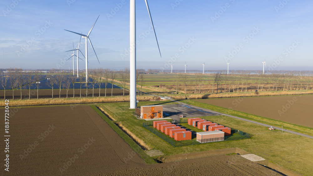 Obraz Pejzaże - Wind turbines farm with battery energy storage system #1887728042