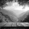 Rustic wooden table foreground overlooks hazy green mountains and river valley below. Sunlight filters through green tree canopy above. Peaceful nature backdrop for outdoor themes. od 0,00 zł Dopasuj i kup Dekor szklany