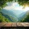 Rustic wooden table foreground overlooks hazy green mountains and river valley below. Sunlight filters through green tree canopy above. Peaceful nature backdrop for outdoor themes. od 0,00 zł Dopasuj i kup