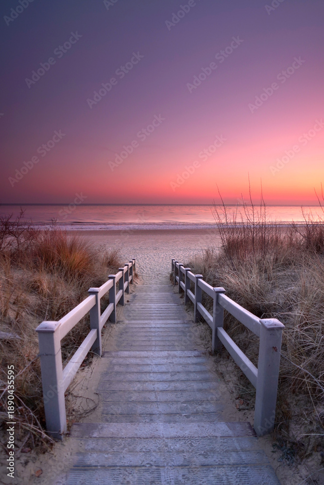 • colorful sunrise over the sea with wooden footpath over dunes