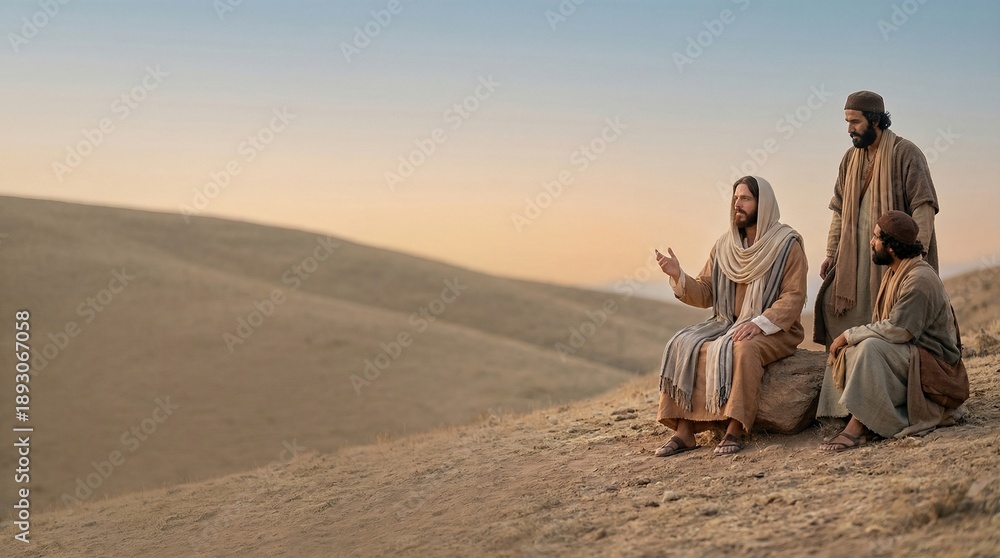 Obraz Pejzaże - Jesus teaching the Sermon on the Mount with two men listening intently on a desert hill. Biblical... #1893067058