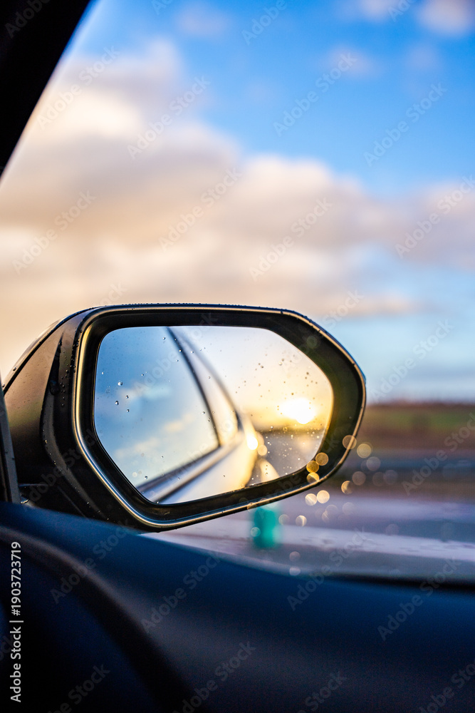 Obraz Pejzaże - A car's rear view mirror reflects the sun #1903723719