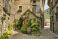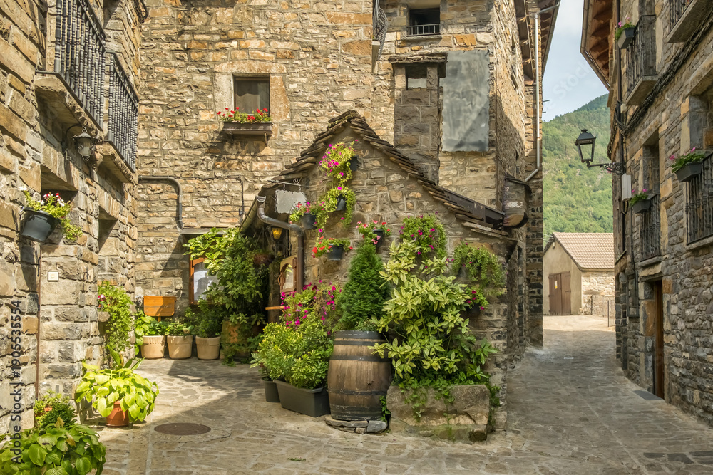 • Traditional stone house with flowers in Torla-Ordesa village Pyrenees Spain