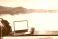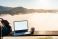 • Empty screen laptop with cup of coffee and backpack with mountain view at sunrise in the morning