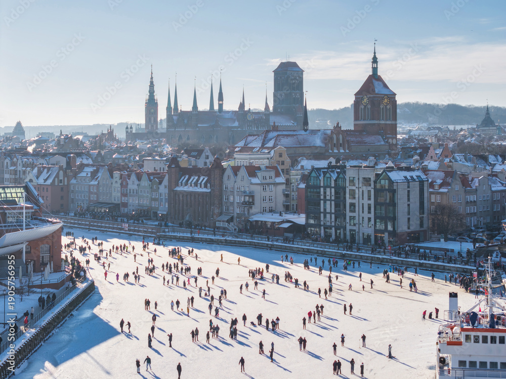 Obraz Pejzaże - Hundreds of people walk along the frozen Motława River in Gdańsk during a frosty winter. Poland #1905756955