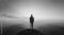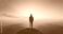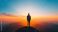 • A man stands on a mountain top at sunset, looking out over the horizon