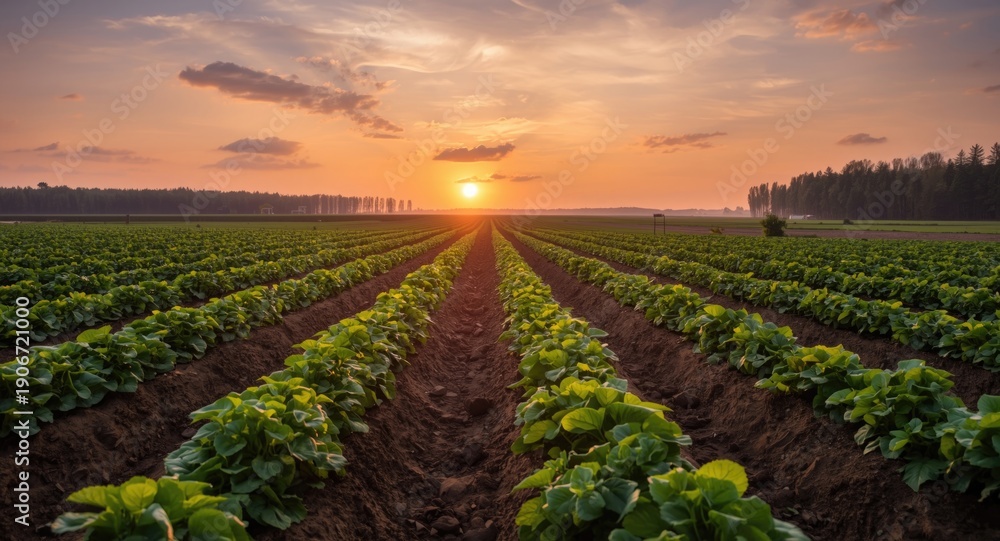 Obraz Pejzaże - Early morning sunrise lighting over potato fields in agricultural plots #1906721000